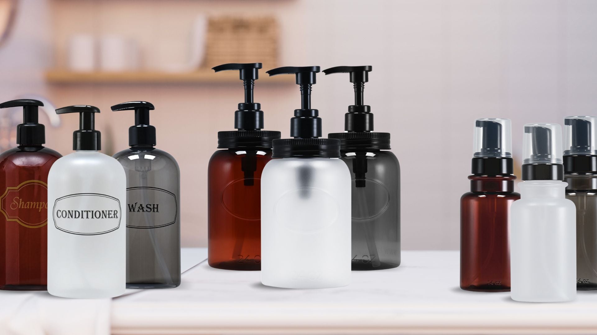 Most of our refillable bottle sets are available in 3 neutral color options, all designed to be neutral and coordinate with most styles of decor. You're sure to find a color you love.