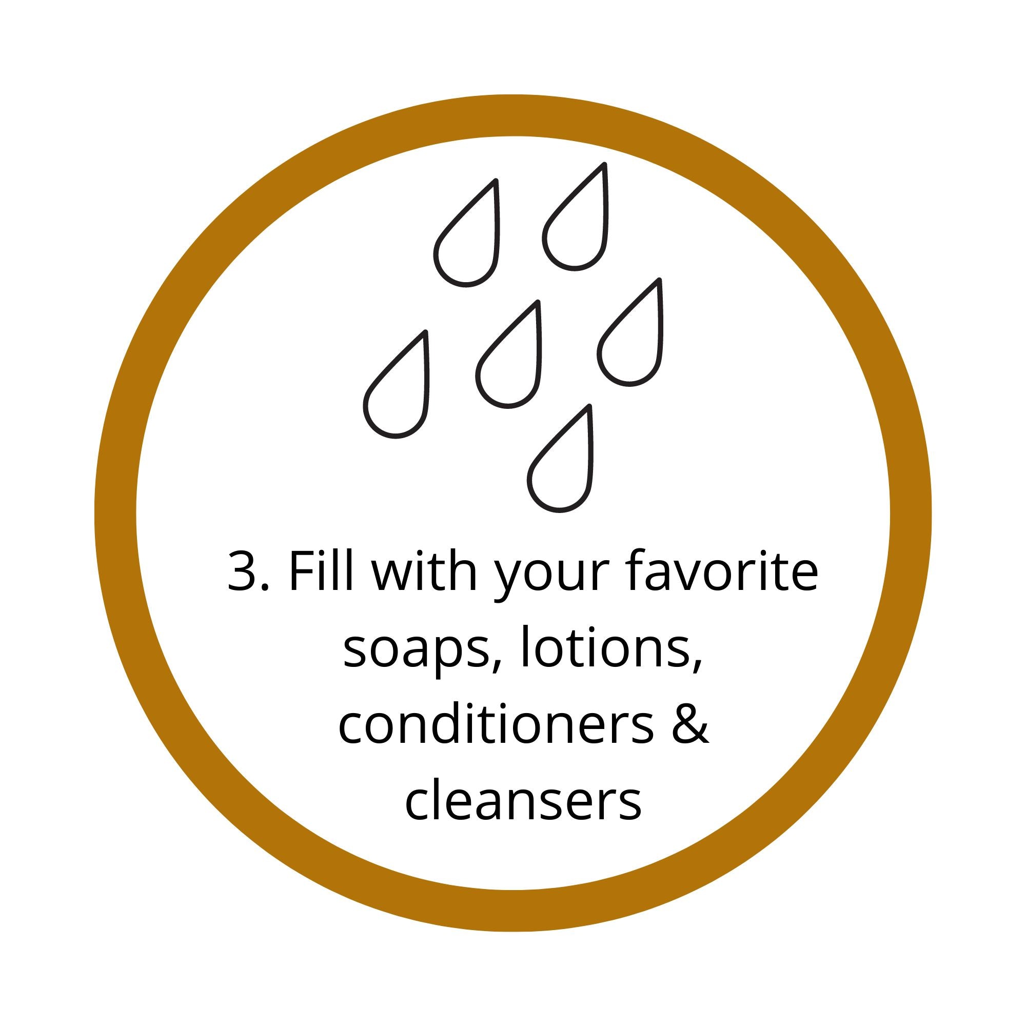 Fill your bottles with your favorite shampoo, conditioner, lotion, body wash, soap and other household liquids. Enjoy the beauty and ease.