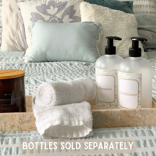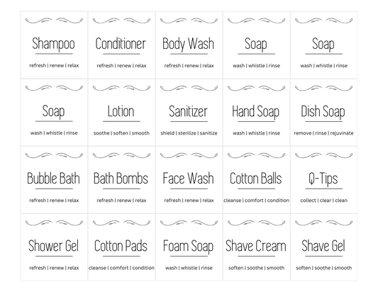 For all printable labels, we recommend either purchasing 8.5"x11" sticker paper and 8.5"x11" self-laminating sheets OR printable 8.5"x11" vinyl sticker sheets. If you're printing labels for shampoo, conditioner and body wash, they'll need to be protected from the water if you want them to last.