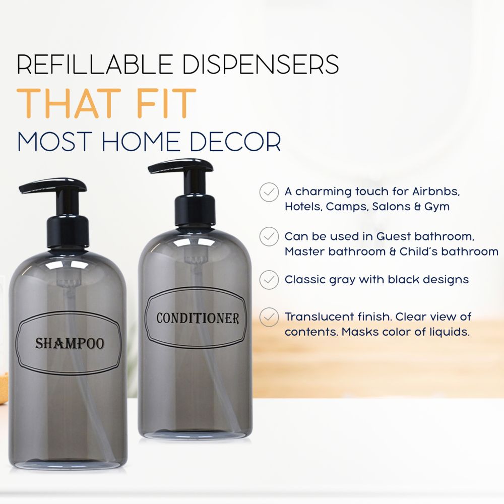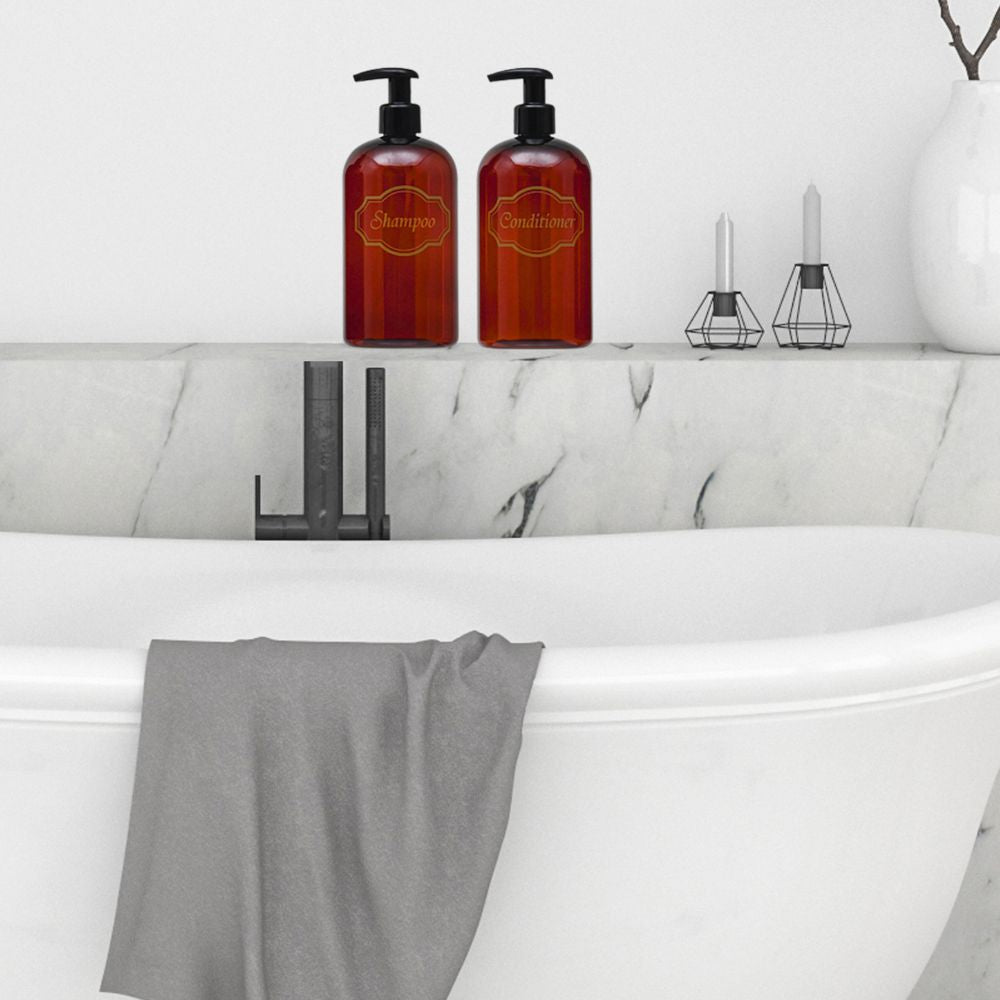 Refillable and beautiful Shampoo, Conditioner bottle sets for your airbnb, vrbo, short term vacation rental, spa, gym showers, or golf club showers.