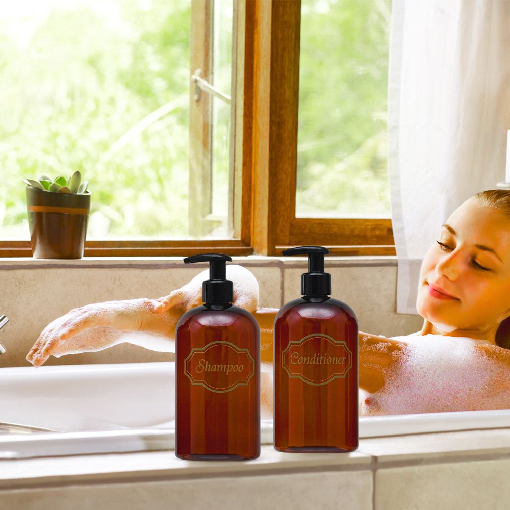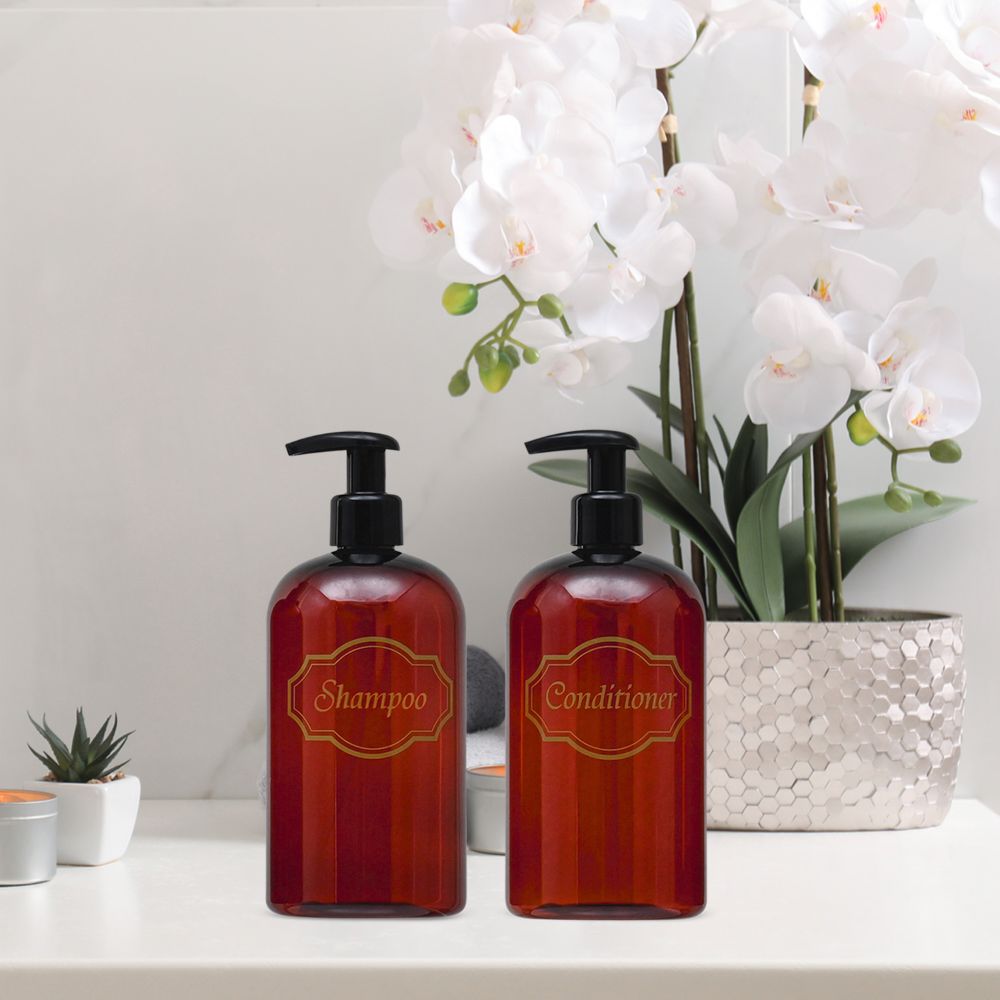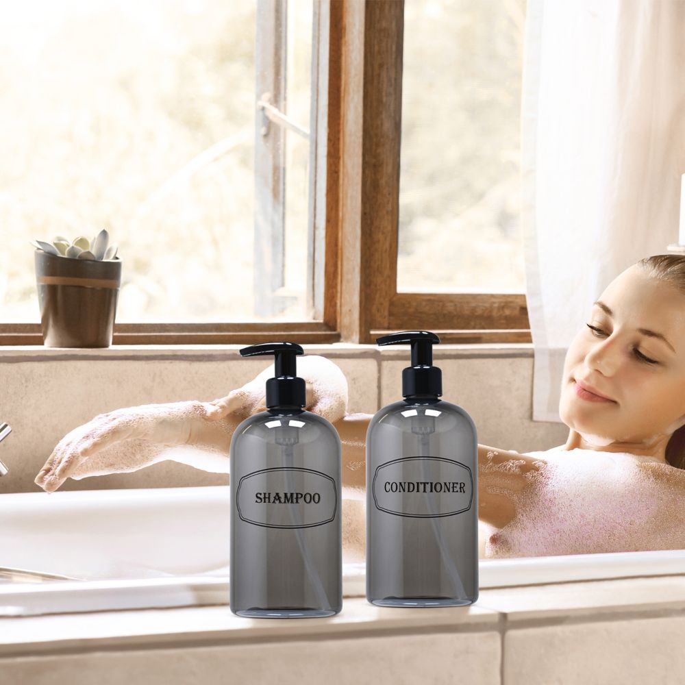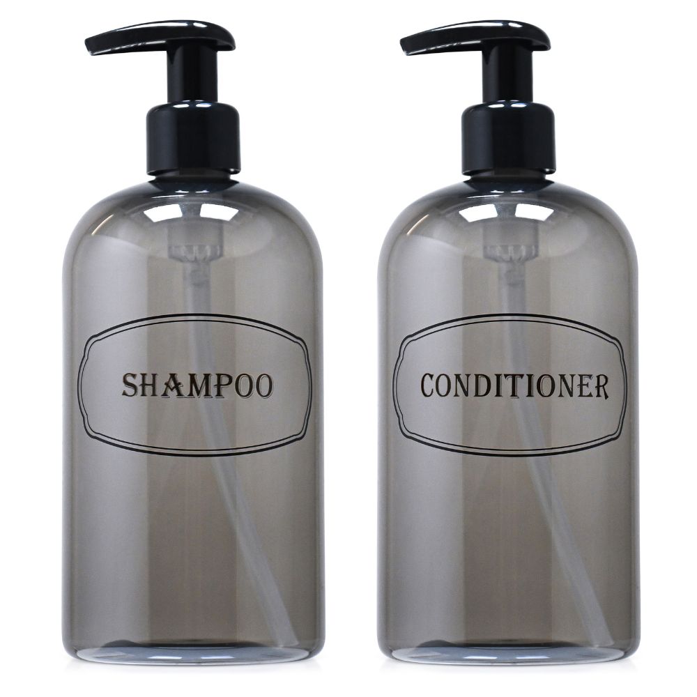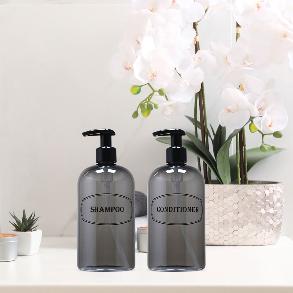 Shampoo, Conditioner dispenser bottles with high-viscosity black lotion pumps.