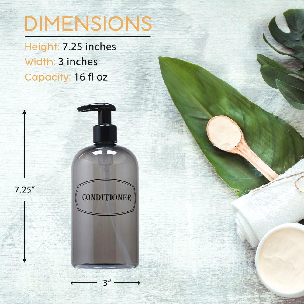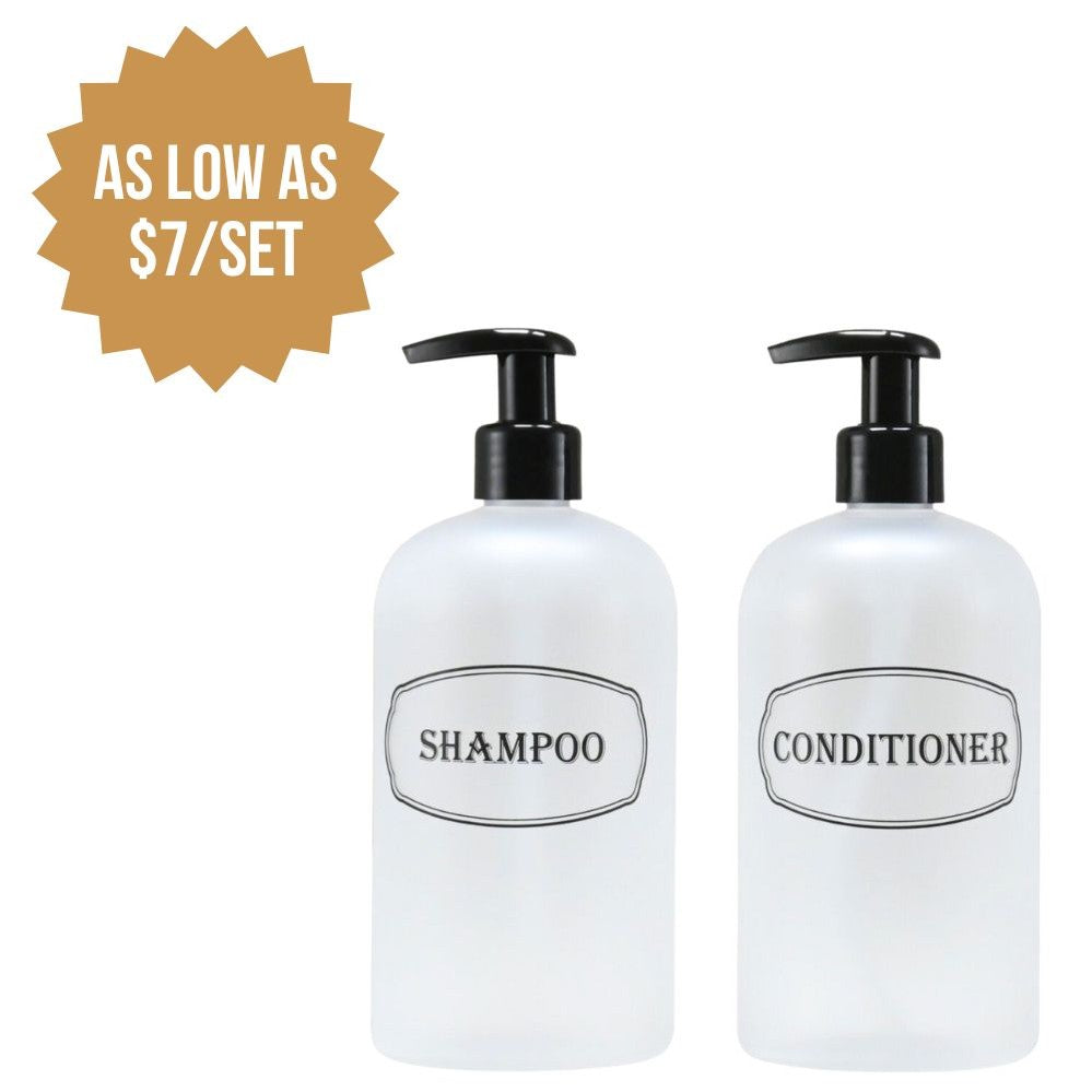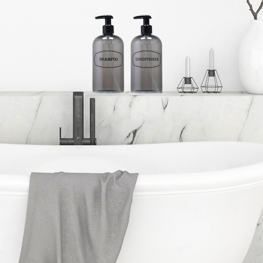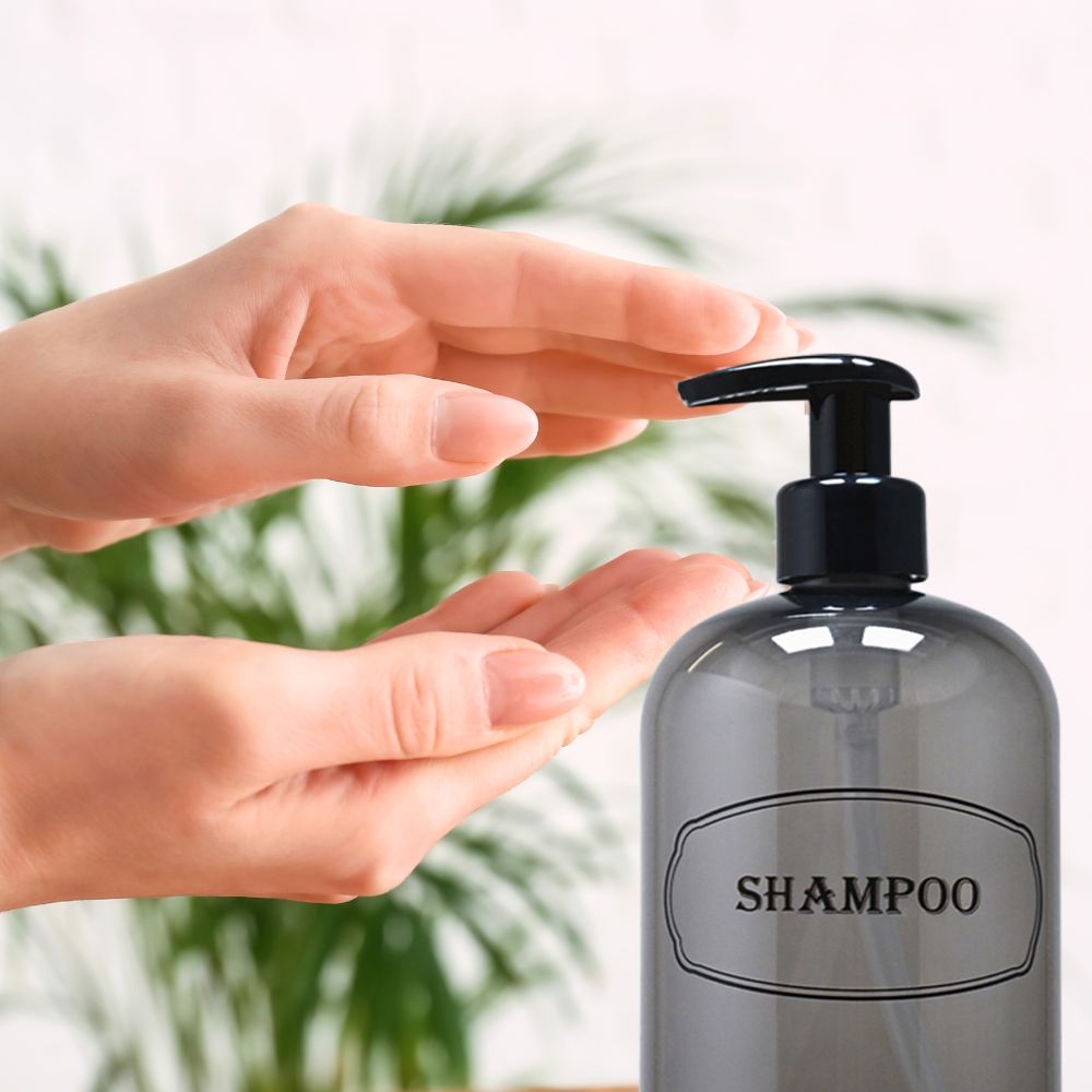 Shampoo, Conditioner dispenser bottles with high-viscosity black lotion pumps.