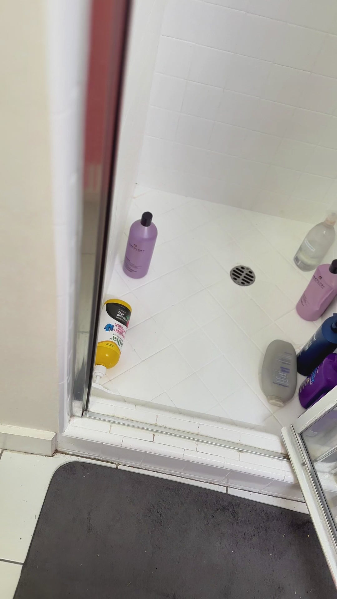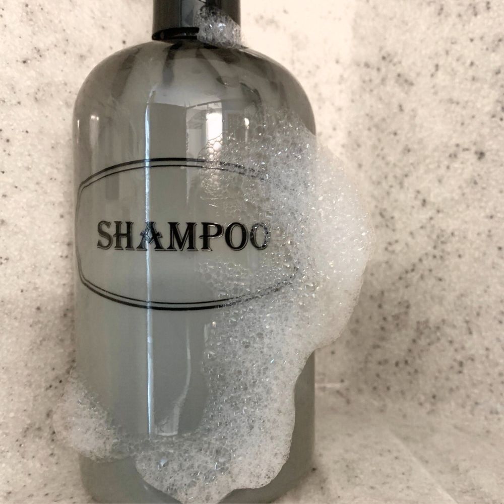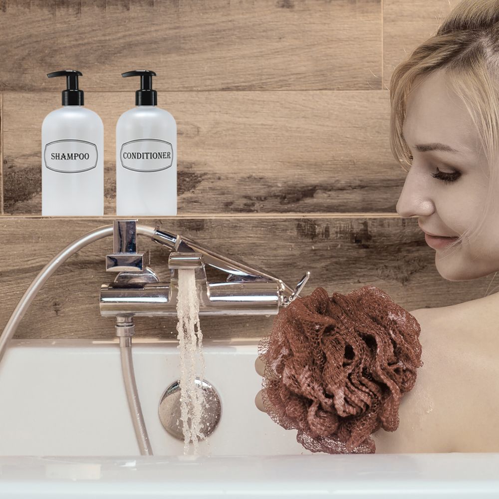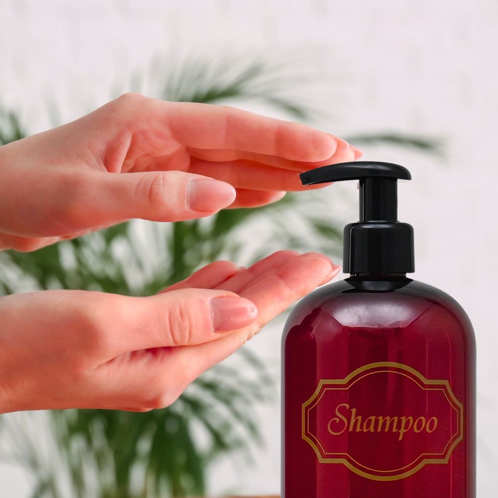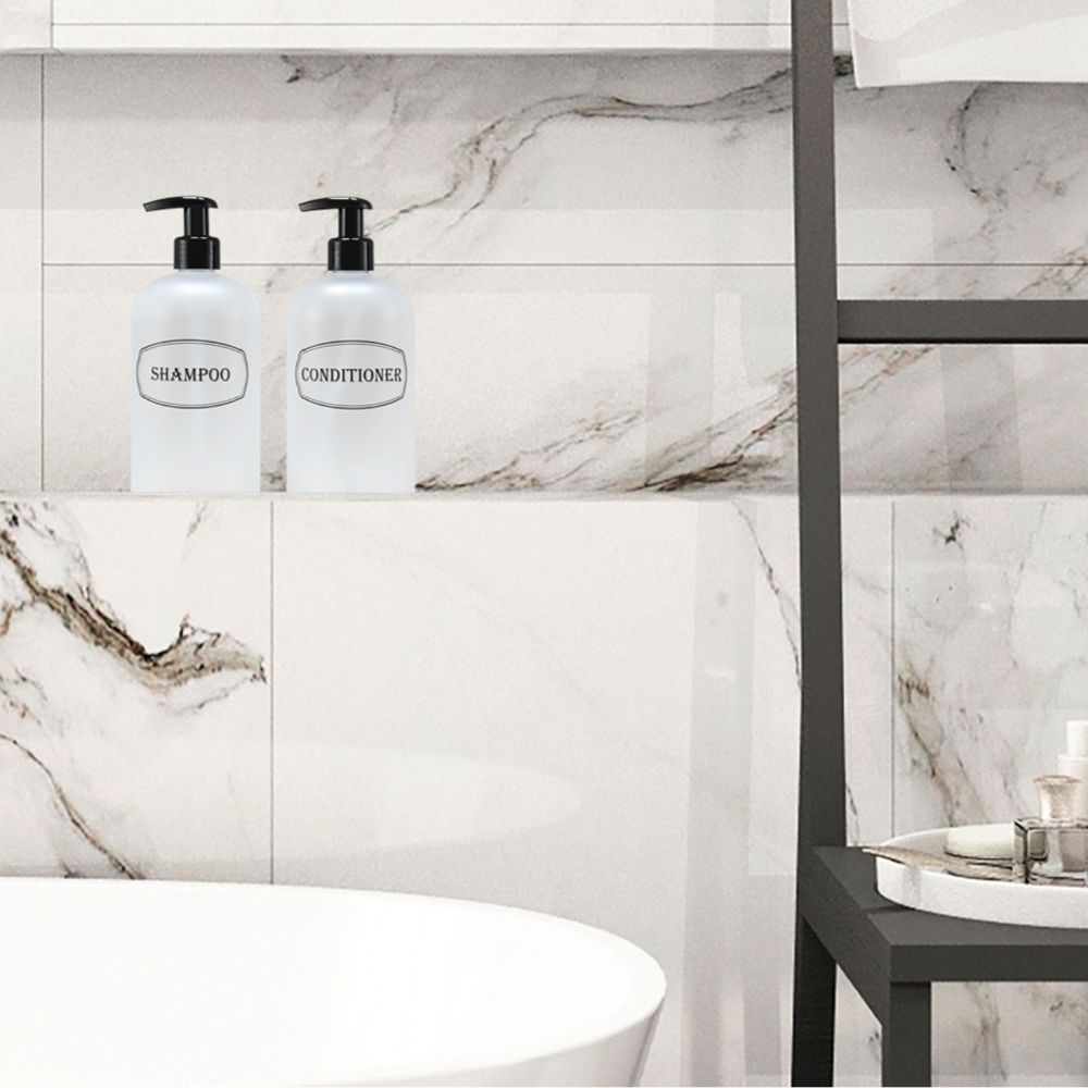 Shampoo, Conditioner dispenser bottles with high-viscosity black lotion pumps.