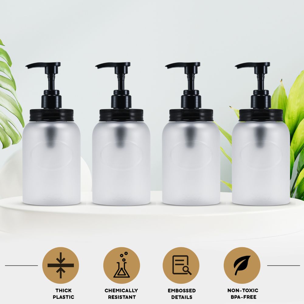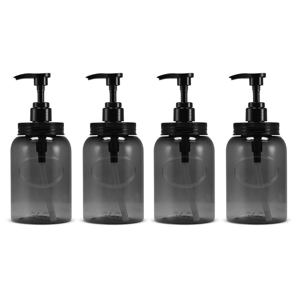 Introducing Bottiful Home's 24 oz Plastic Refillable Wide Mouth Jar-Style Pump Bottle Dispenser Set of 4, the ultimate solution for your household liquids!